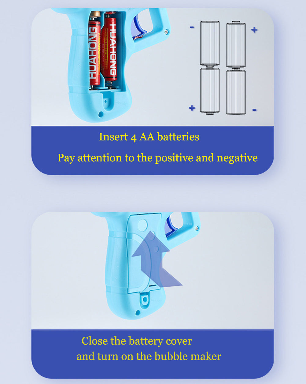 Powered by 3 AA batteries, our Automatic Bubble Gun Toy produces a burst of air bubbles for hours of entertainment. Just tap the bubble liquid, pull the trigger, and you'll be blasting tons of bubbles!